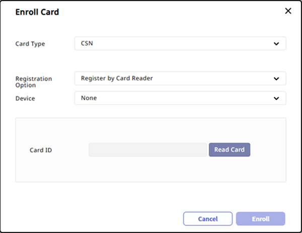 Register by Card Reader: Selecciona el dispositivo de la lista Device para escanear la tarjeta y haz clic en el botón Read Card.