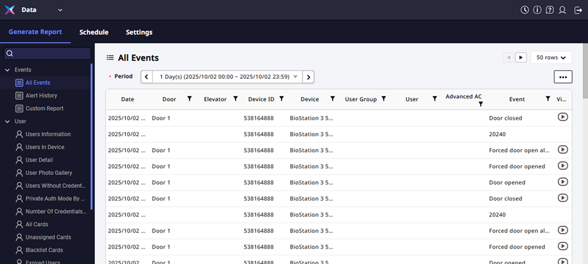 Con el menú Data, puede consultar la información de los usuarios registrada en BioStar X o los eventos que cumplan criterios específicos y generar informes con una programación periódica. Puede generar automáticamente el informe deseado de forma periódica si es necesario, y el informe generado se puede exportar como archivos CSV o PDF o imprimir.