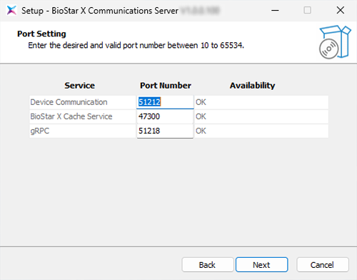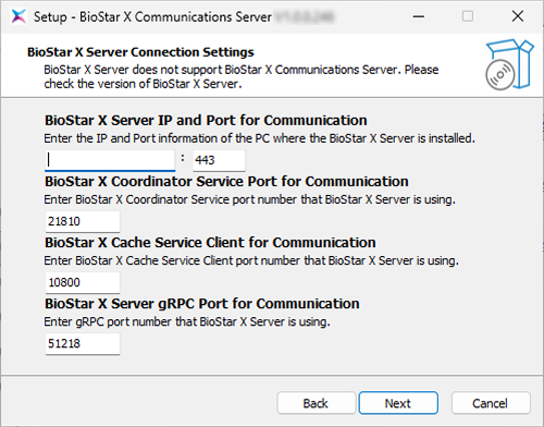 | BioStar X Service Manager | Información requerida para la instalación del servidor de comunicación |
