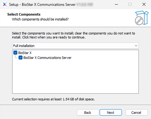 Acceda al Suprema Download Center, inicie sesión y descargue el paquete de instalación (BioStar X Communications Server.X.Y.X.BB.exe).