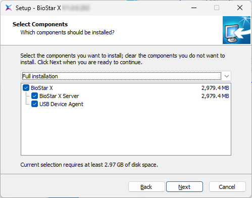 Seleccione los componentes de BioStar X y haga clic en Siguiente. Al seleccionar USB Device Agent, se instalarán conjuntamente el USB Agent y el controlador para usar BioMini, BioMini Plus 2, BioMini Slim 2 y DUALi DE-620.