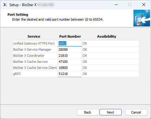 Configure el puerto de comunicación de BioStar X y haga clic en Siguiente.