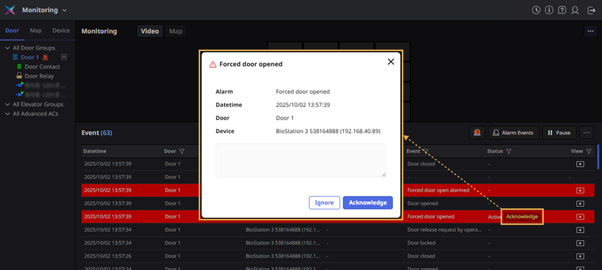 Haz clic en Acknowledge que aparece en la columna Status de la lista de eventos para registrar la confirmación y las acciones relacionadas con los eventos de alarma activados. Completa tu entrada y haz clic en Acknowledge.