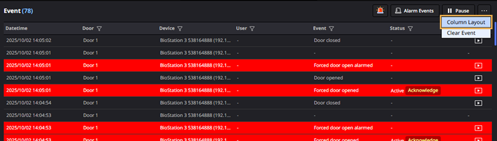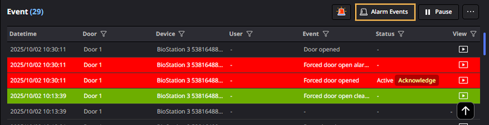 Status: Estado del evento. Los eventos activos se muestran como Active. Los eventos de alarma muestran un botón Acknowledge. Haga clic en Acknowledge para resolver el evento.