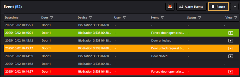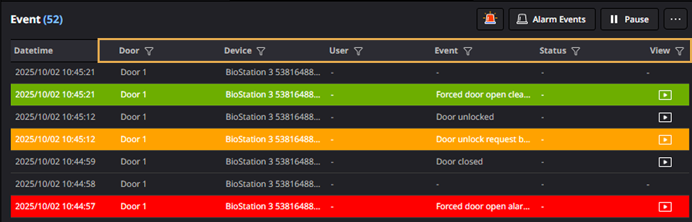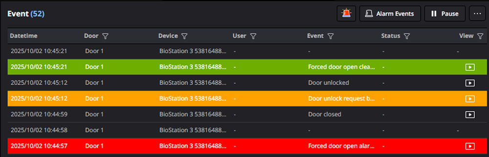 View: Si el evento incluye información de video de la cámara conectada a la puerta, se muestra un ícono de video (). Haga clic en este ícono para ver el video.