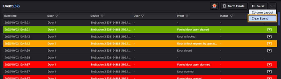 En la sección Event, borre eventos. Haga clic en en la esquina superior derecha de la sección Event y seleccione Clear Event en el menú emergente. Si hay muchos eventos innecesarios acumulados en la lista, utilice la función Clear Event para limpiarla.