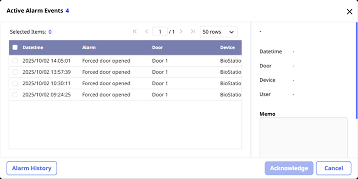 Selecciona más de un evento de la lista de eventos de alarma para activar el botón Acknowledge.