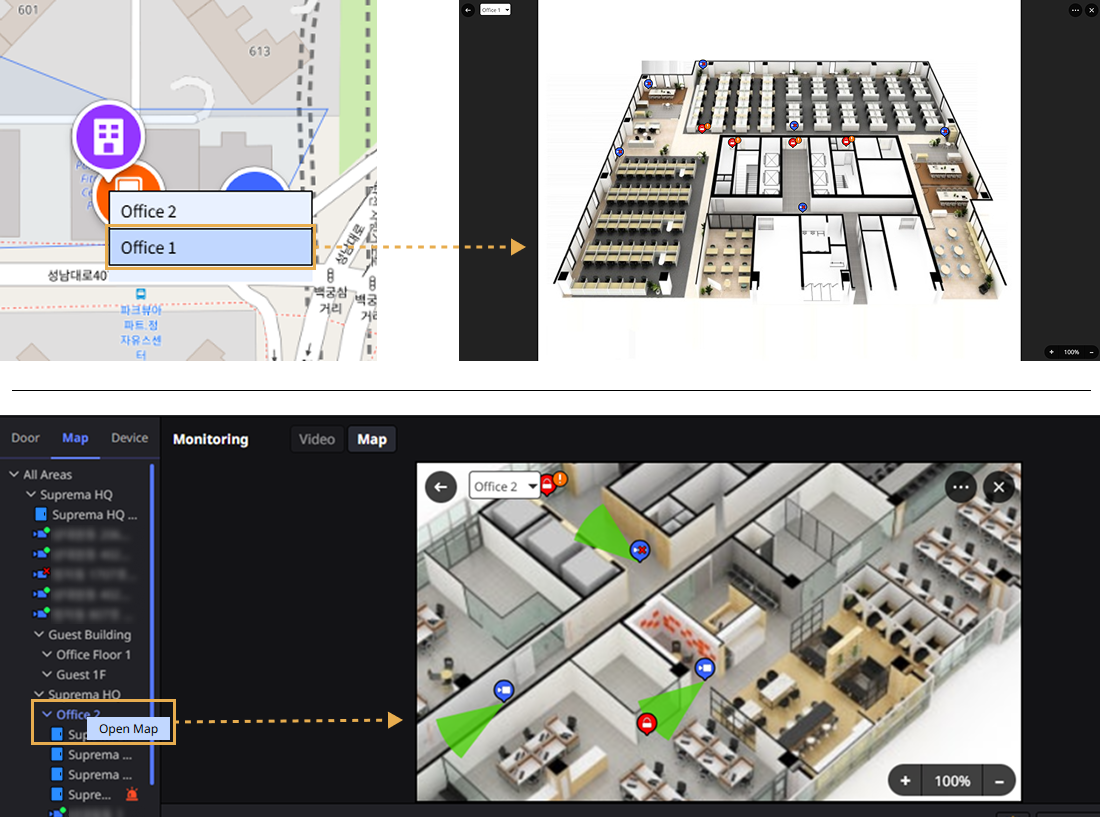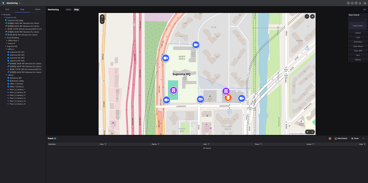 Esta guía explica cómo monitorear y controlar el estado en tiempo real de puertas y cámaras por zona y piso mediante la función de monitoreo de mapas. El monitoreo de mapas permite navegar fácilmente por áreas y pisos a través de una interfaz visual integrada con Google Maps, habilitando funciones como el control de puertas de acceso y la reproducción de video de cámaras.