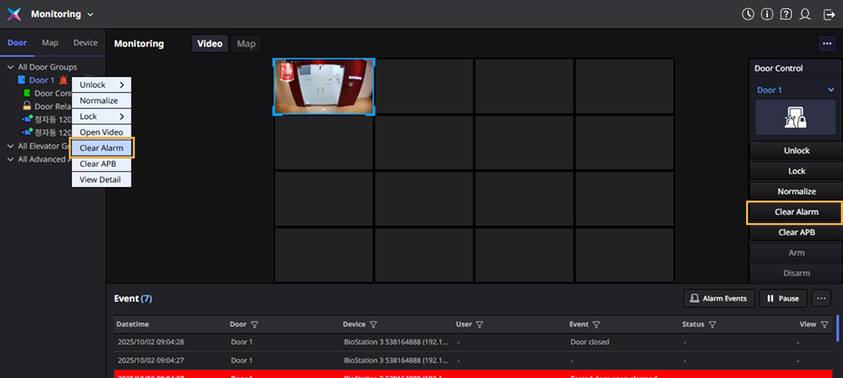 Para borrar la alarma de la puerta, haga clic con el botón derecho en la puerta de la lista y haga clic en Clear Alarm en el menú emergente. Como alternativa, haga clic en la herramienta Door Control y luego en Clear Alarm.