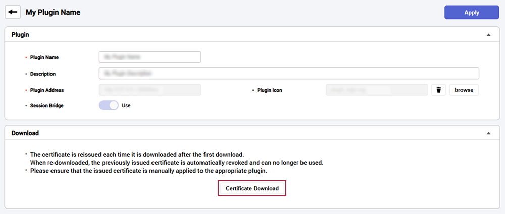 Ingresa la información del complemento y haz clic en Apply para completar el registro.