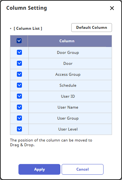 Puede ocultar o mostrar las columnas deseadas en la tabla de la lista de estado de permisos de acceso. Haga clic en en la esquina superior derecha de la pantalla y seleccione Column Setting.