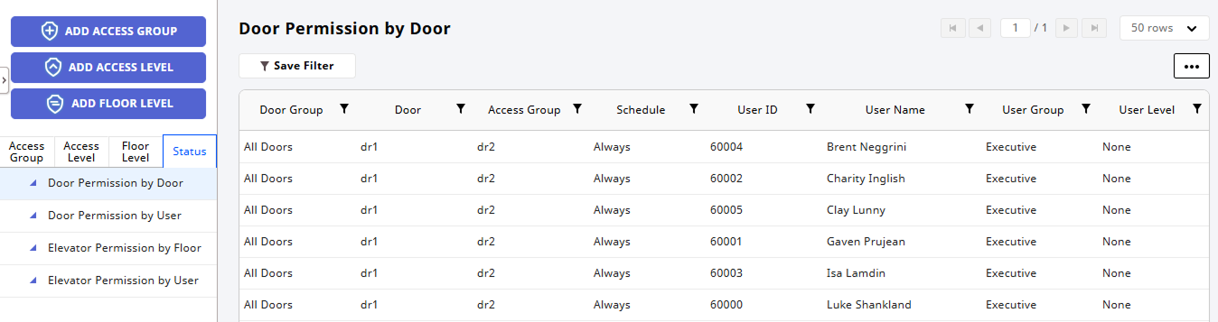 Esta guía explica cómo verificar la lista de puertas a las que pueden acceder los usuarios. Al verificar el estado de los permisos de acceso, podrá administrar las puertas a las que un usuario puede acceder y los permisos para esas puertas. Utilice la función de filtro para ordenar los resultados deseados y guardar la lista en un archivo CSV.