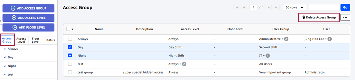 Haga clic en Delete Access Group en la esquina superior derecha de la pantalla.