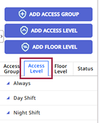 Los niveles de acceso permiten a los usuarios establecer horarios de entrada y conceder permiso para acceder a las puertas durante esos horarios. Los niveles de acceso son un elemento clave para configurar grupos de acceso.
