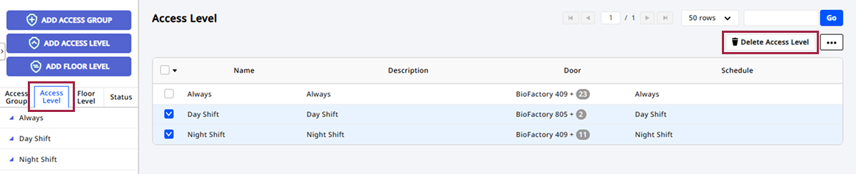Haz clic en Delete Access Level en la parte superior derecha de la pantalla.