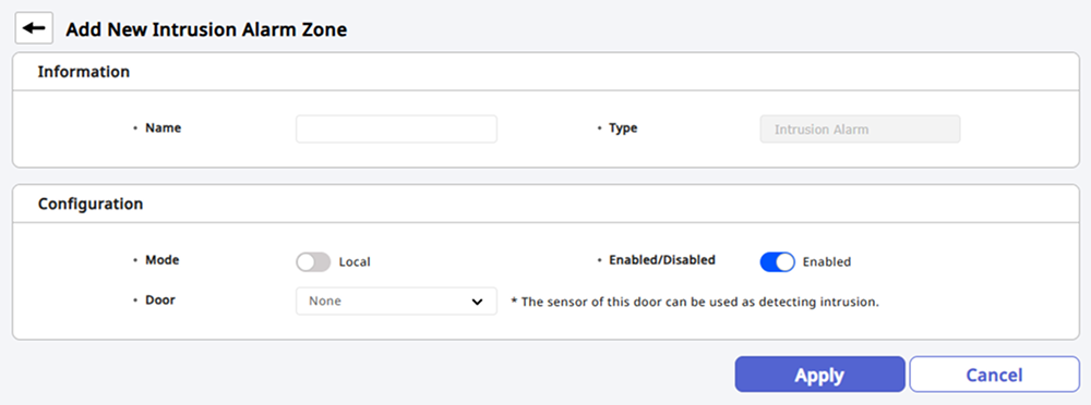 Mode: Establece el alcance de aplicación. Los ajustes de alarma de intrusión solo admiten el modo Local y solo se pueden configurar con dispositivos conectados mediante RS-485 y dispositivos de entrada.