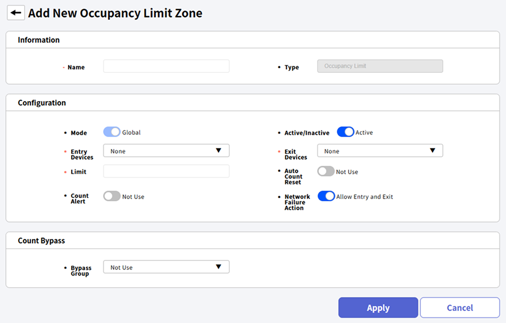 Limit: Ingrese el número de personas a limitar para la entrada. El ingreso se restringe si el número de personas alcanza el límite de ocupación establecido. Ingrese un número de 0 a 10,000; si lo establece en 0, el acceso será ilimitado.