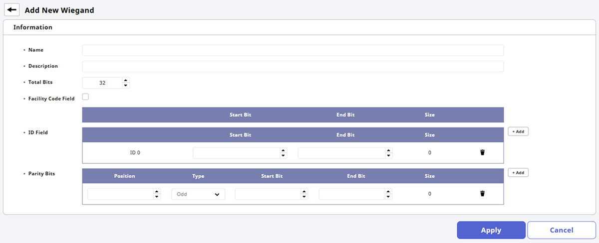 Cuando aparezca la pantalla Add New Wiegand, configure cada elemento. Para obtener más información, consulta lo siguiente.