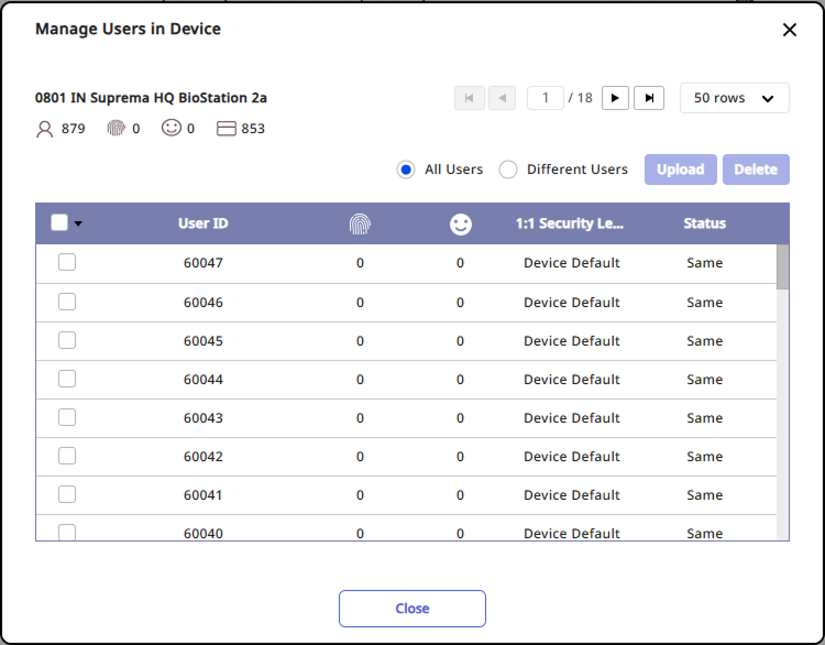 Cuando aparezca la ventana Manage Users in Device, compara la información de usuario registrada en el dispositivo con la información de usuario registrada en BioStar X.