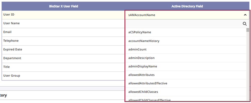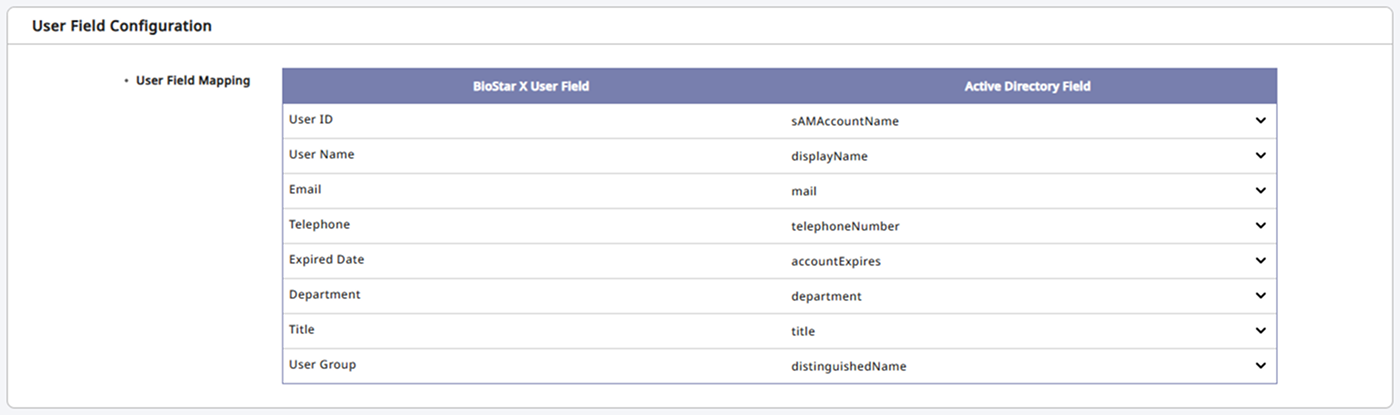 De forma predeterminada, cada campo de usuario de BioStar X se asigna a los elementos que coinciden con la información de usuario de Active Directory. Haz clic en el campo en Active Directory Field para seleccionar un valor de campo diferente al predeterminado.