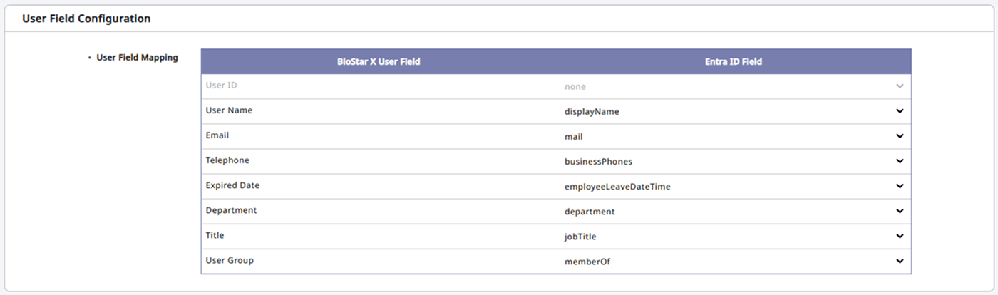 Configura el campo de Entra ID para asignarlo a los campos de usuario de BioStar X. Selecciona el campo de Entra ID que se usará como campo de usuario de BioStar X en la sección User Field Configuration.