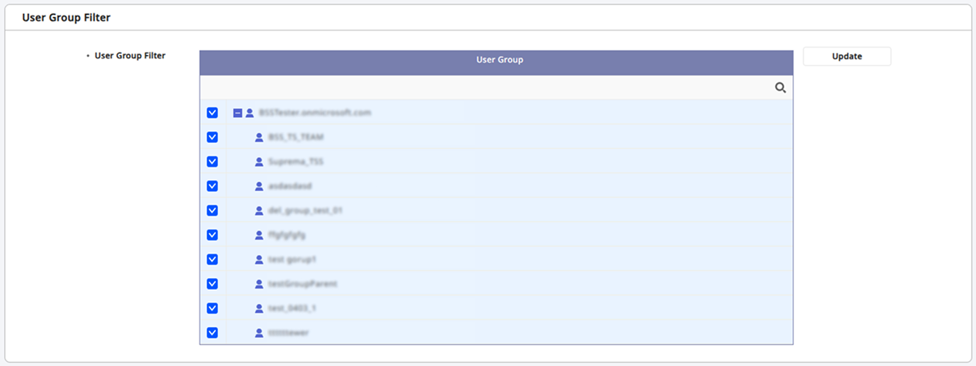 Después de completar la configuración en Directory Server y hacer clic en Connect, la información de los grupos de usuarios de Active Directory se recuperará en User Group Filter. Desmarque los grupos de usuarios que no se sincronizarán con BioStar X.
