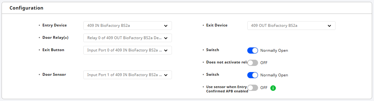 En la sección Configuration, configure los dispositivos conectados a la puerta, los botones de salida y los sensores de puerta.