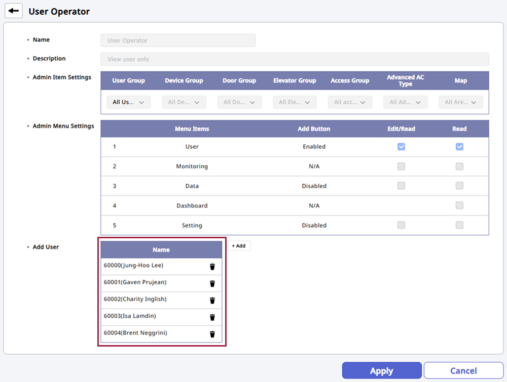 T&A Operator: El menú TIME ATTENDANCE tiene permisos de lectura y escritura.