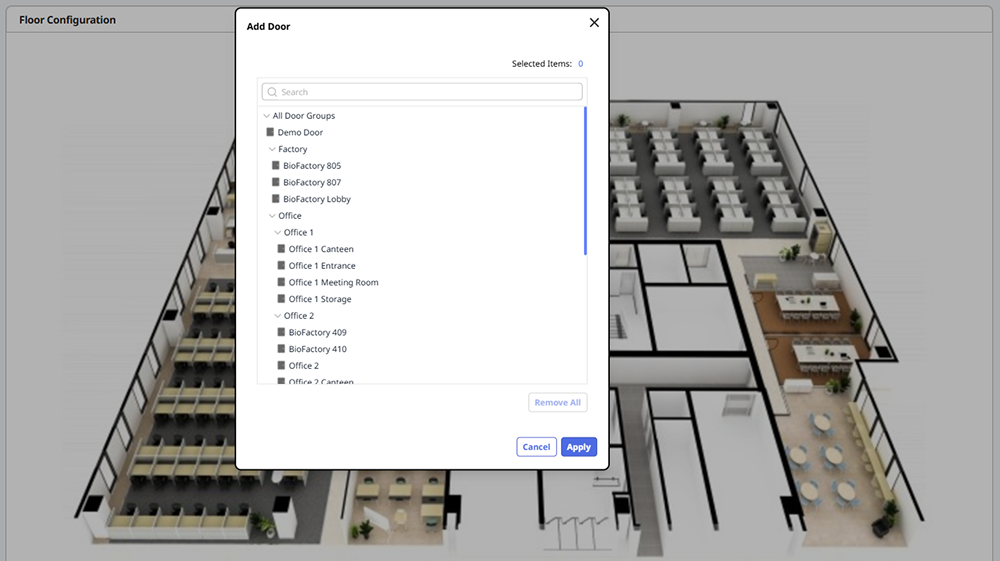 Para agregar una puerta a la imagen cargada en la sección Floor Configuration, haz clic derecho en la ubicación deseada de la imagen y selecciona Add Door.
