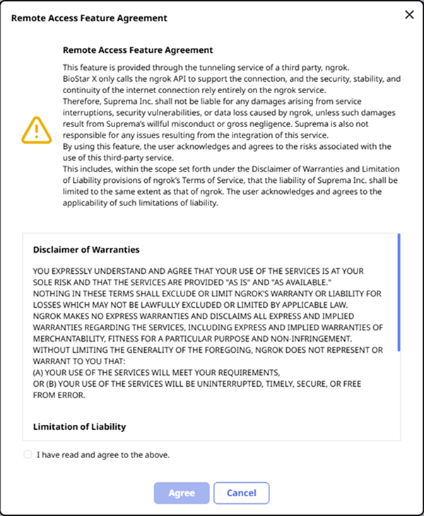BioStar X solo admite la conexión llamando a la API de ngrok, pero la seguridad y continuidad de la conectividad a Internet dependen completamente del servicio ngrok. Por lo tanto, Suprema no asume ninguna responsabilidad por incidentes de seguridad, pérdida de datos o vulneraciones del sistema que puedan ocurrir durante el uso de esta función.