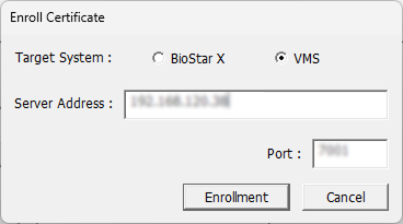 La dirección IP introducida en Enroll Certificate debe ser la misma que la establecida en BioStar X. Compruébela en la ruta de menú Settings → Server → Server en BioStar X IP Address.