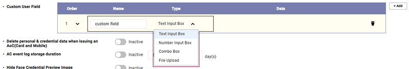 En la opción Custom User Field, agregue campos para ingresar información adicional del usuario. Los campos agregados se mostrarán en la pantalla de información del usuario.