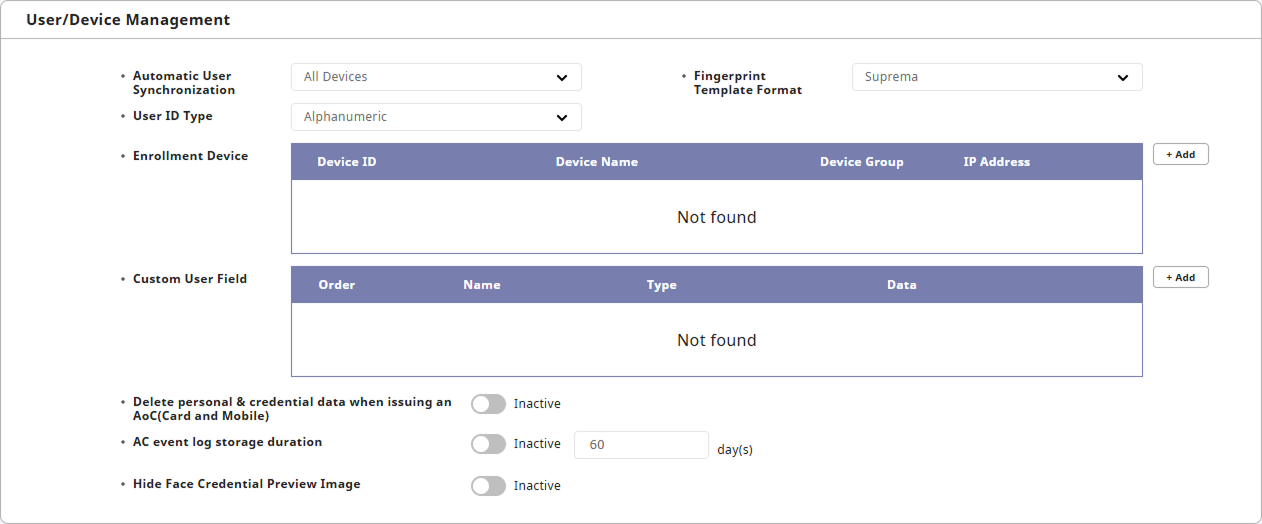 En la opción User ID Type, seleccione el tipo de ID de usuario como Number o Alphanumeric. Revise la lista de dispositivos registrados en el servidor BioStar X y seleccione la configuración compatible.