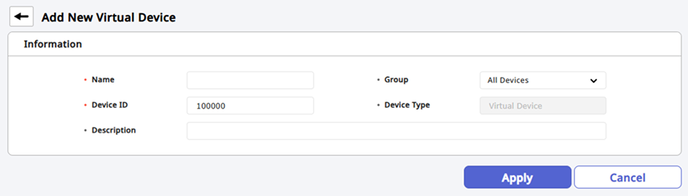 Device ID: Ingrese el ID único del dispositivo virtual. Debe especificarse dentro de un rango que no duplique un ID de dispositivo existente.