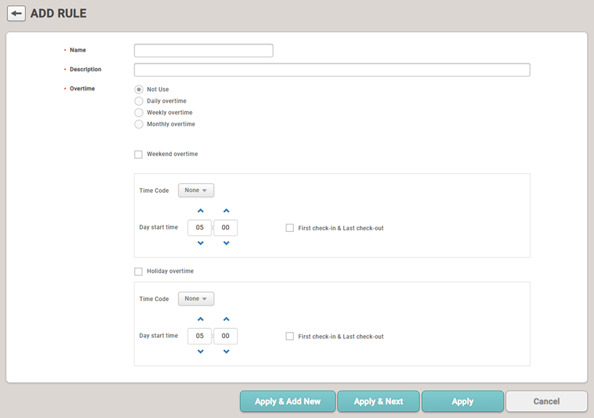 Esto es útil cuando las reglas de horas extra no se añaden a Shift. Los ajustes de horas extra en Shift tienen horas de inicio y fin, mientras que Rule calcula el total de horas más allá del horario laboral regular. Rule es conveniente para gestionar el total de horas extra de forma diaria, semanal o mensual. Cuando se configura Rule, reemplaza las reglas de horas extra añadidas a Shift.