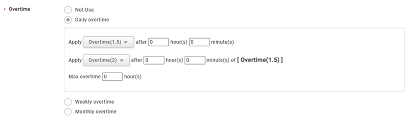 Overtime: Seleccione las reglas de horas extra que se aplicarán después del horario laboral regular de forma diaria, semanal o mensual. Puede aplicar otras reglas de horas extra después de un cierto período de tiempo. También puede establecer un límite máximo de horas extra para restringir la cantidad de horas extra que un empleado puede trabajar.