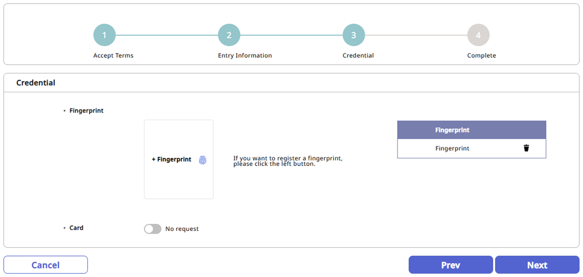 Fingerprint: Para usar autenticación por huella digital, haga clic en el botón + Fingerprint y luego registre su huella.