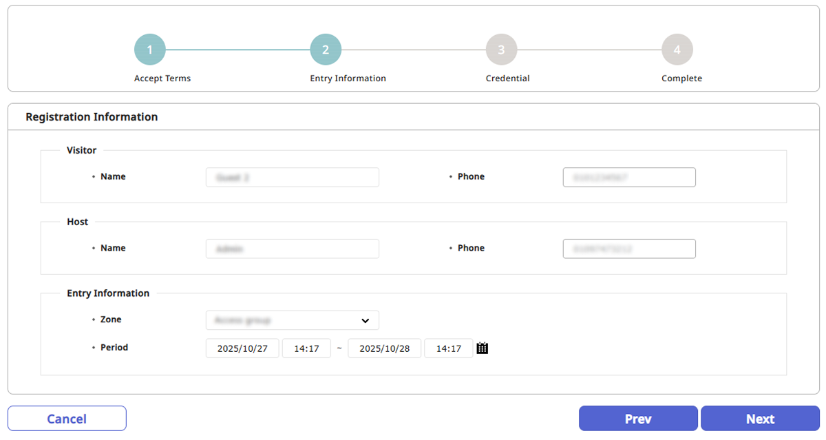 Entry Information: Configure el área de acceso y la duración de la visita.