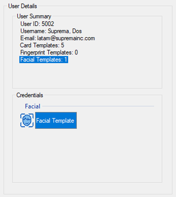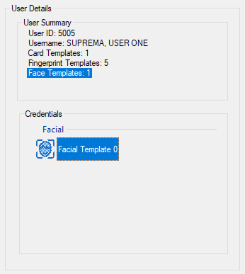 After the Face has been registered, you can see or delete the credential by double clicking the Facial Templates under User Summary:
