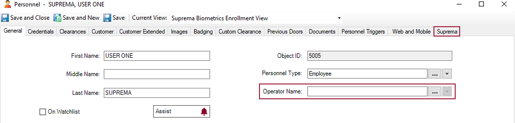 There you will find the Suprema TAB, located at the end of the Personnel View tabs.