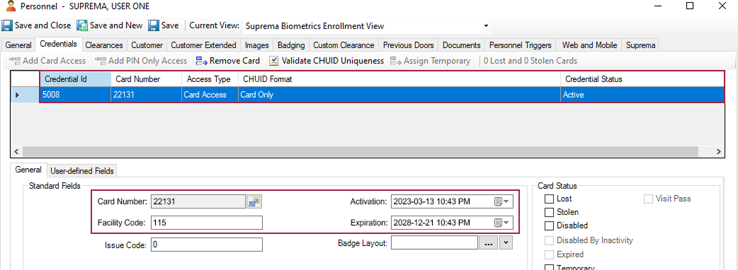 After you click the Enroll Card button you should click the Save button in the upper menu within the Personnel window for the changes made in the Suprema TAB to be reflected in C•CURE.