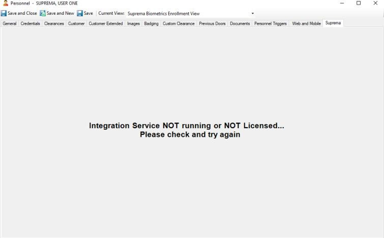 In the first run or when a license is not properly validated or the Suprema - C•CURE Integration Service is not running, you will visualize.