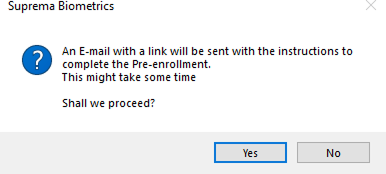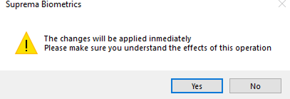 When the warning message is displayed and you click Yes, the data will be sent to the Suprema devices right away and will be available immediately. Click No to dismiss the dialog.