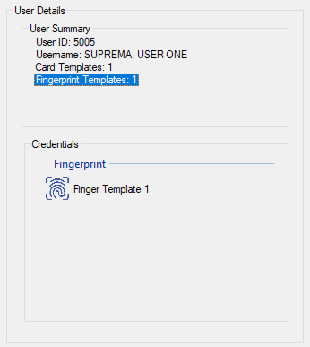After the Fingerprint has been registered, you can see or delete the credential by double clicking the Fingerprint Templates under User Summary: