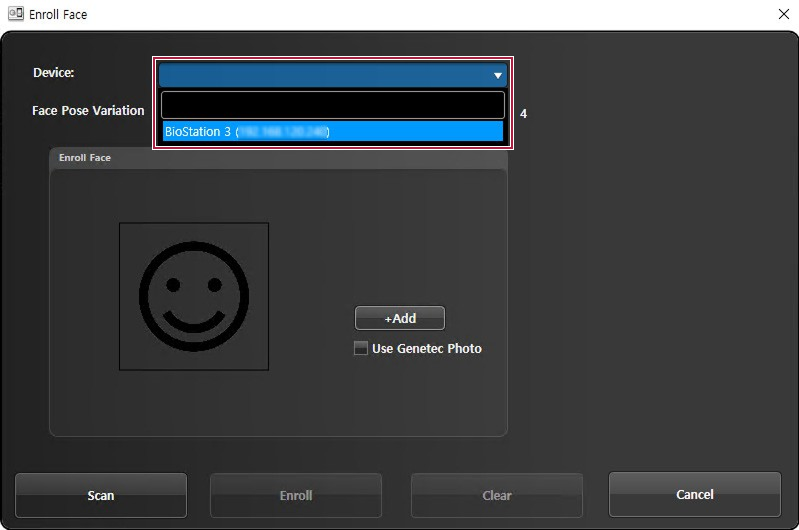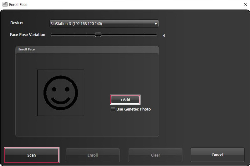 Click the +Add button to create a face template, then click the Scan button and scan the face on the device.