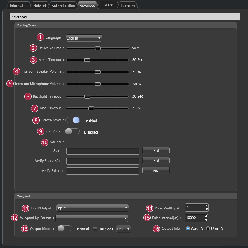 | Sound | Configures the sound effect for boot, authentication success, and authentication failure events. Click Find and select a *.wav file (less than 500 KB). | |