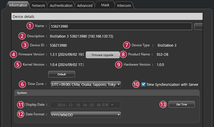 | Time Synchronization with Server | Select the option to synchronize the time information of the device with the server. | |