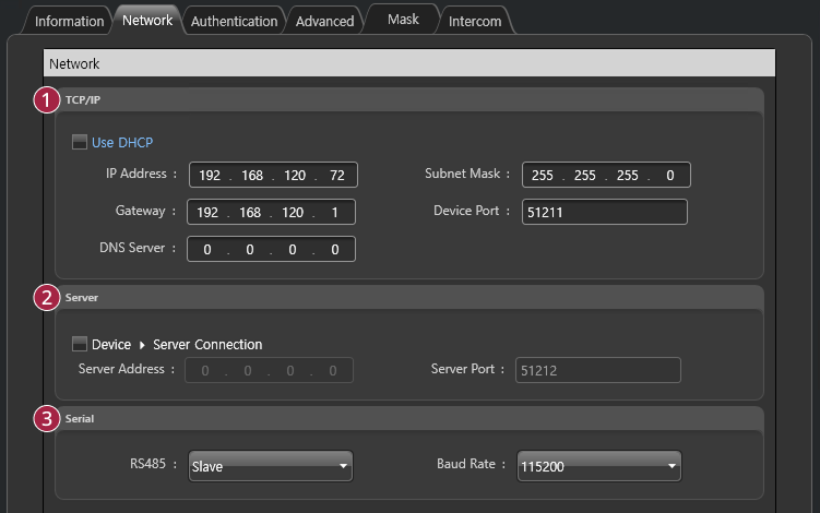 | Serial | You can configure the connection mode, and baud rate of devices connected over RS-485.