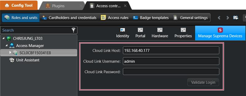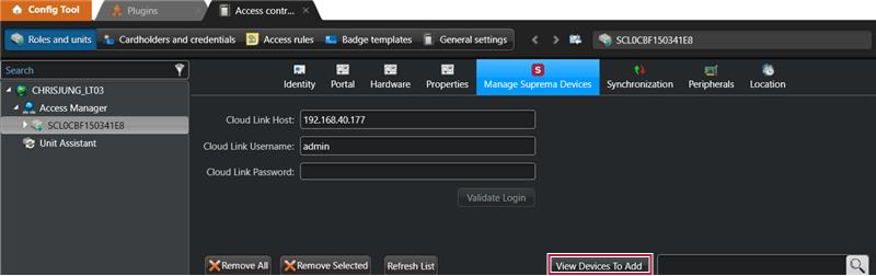 Config Tool → Access Control → Cloud Link → Peripherals Tab will not apply to the Suprema device directly.