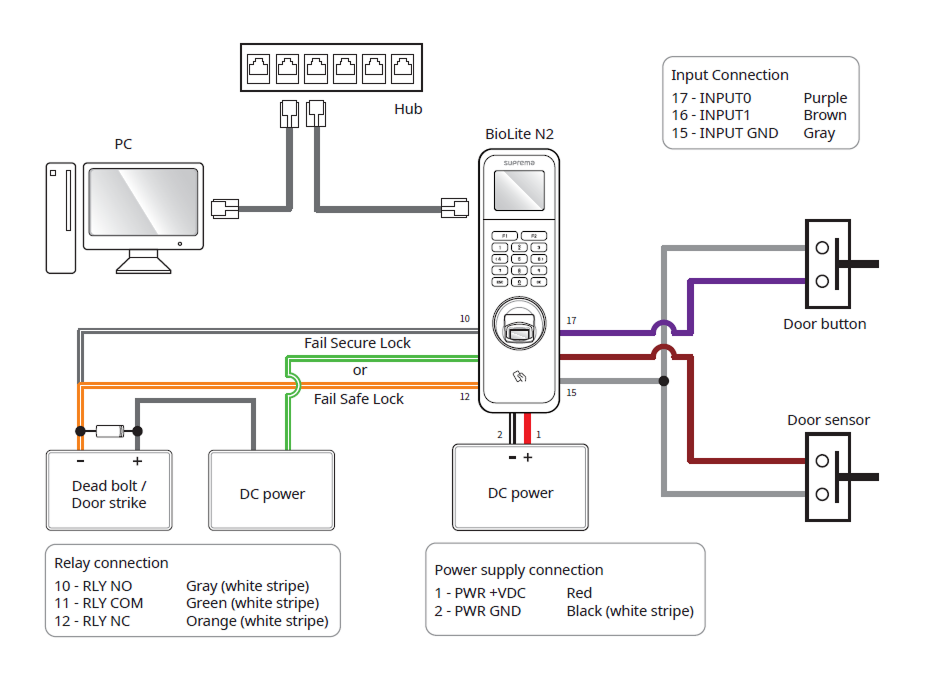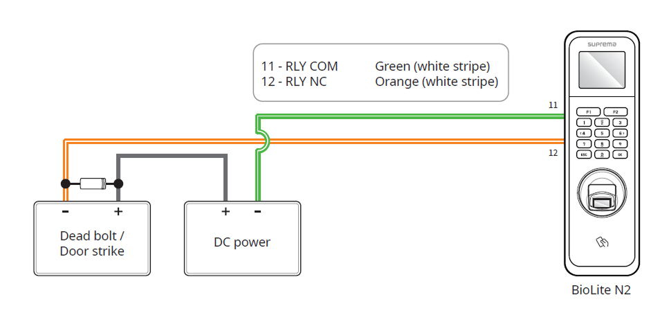 Suprema のインテリジェントデバイスには、利便性向上のためにコントローラーを介さずスタンドアロンで接続し、扉を直接開閉できるリレーが内蔵されています。 しかし、より高いセキュリティが求められる入退室管理アプリケーションでは、扉のロック解除を引き起こす可能性のある改ざん攻撃を防ぐため、デバイス内蔵のリレーを使用しないことを推奨します。 このようなアプリケーションでは、ロック制御用に扉内部の安全な位置に設置した Suprema Secure I/O 2、DM-20、CoreStation などの別体リレー装置の使用を推奨します。